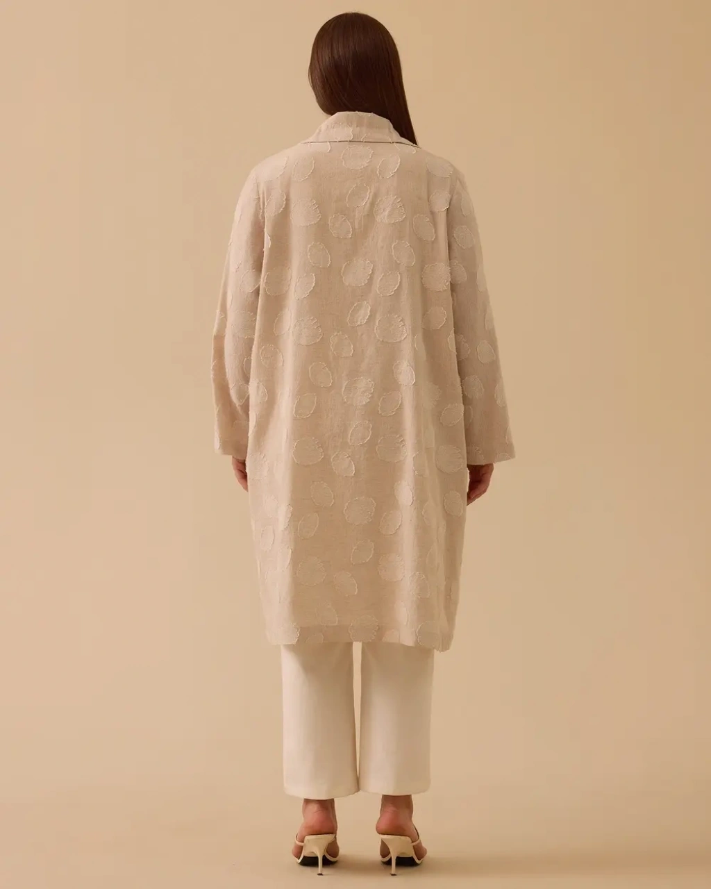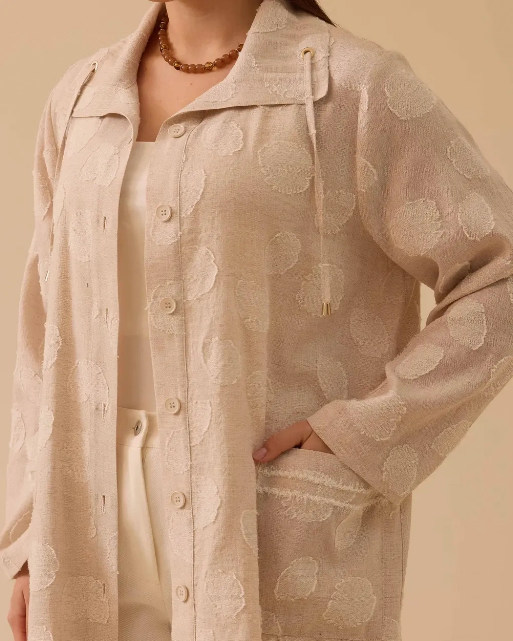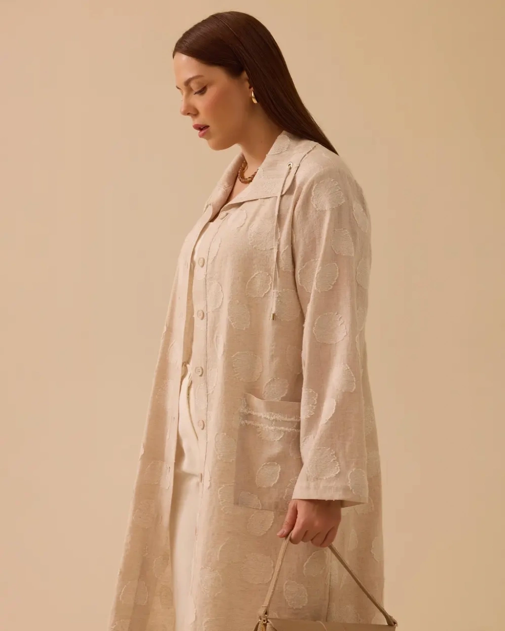 Büyük Beden Devrik Yaka Keten Kap, hafif dokusu ve rahat kesimiyle şık bir görünüm sunar.