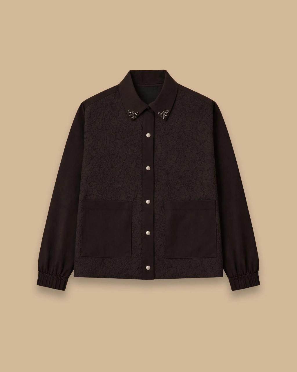 Taş Detaylı Cepli Dokuma Ceket, yaka kısmındaki zarif taş detaylarıyla şıklığı ön plana çıkarır.